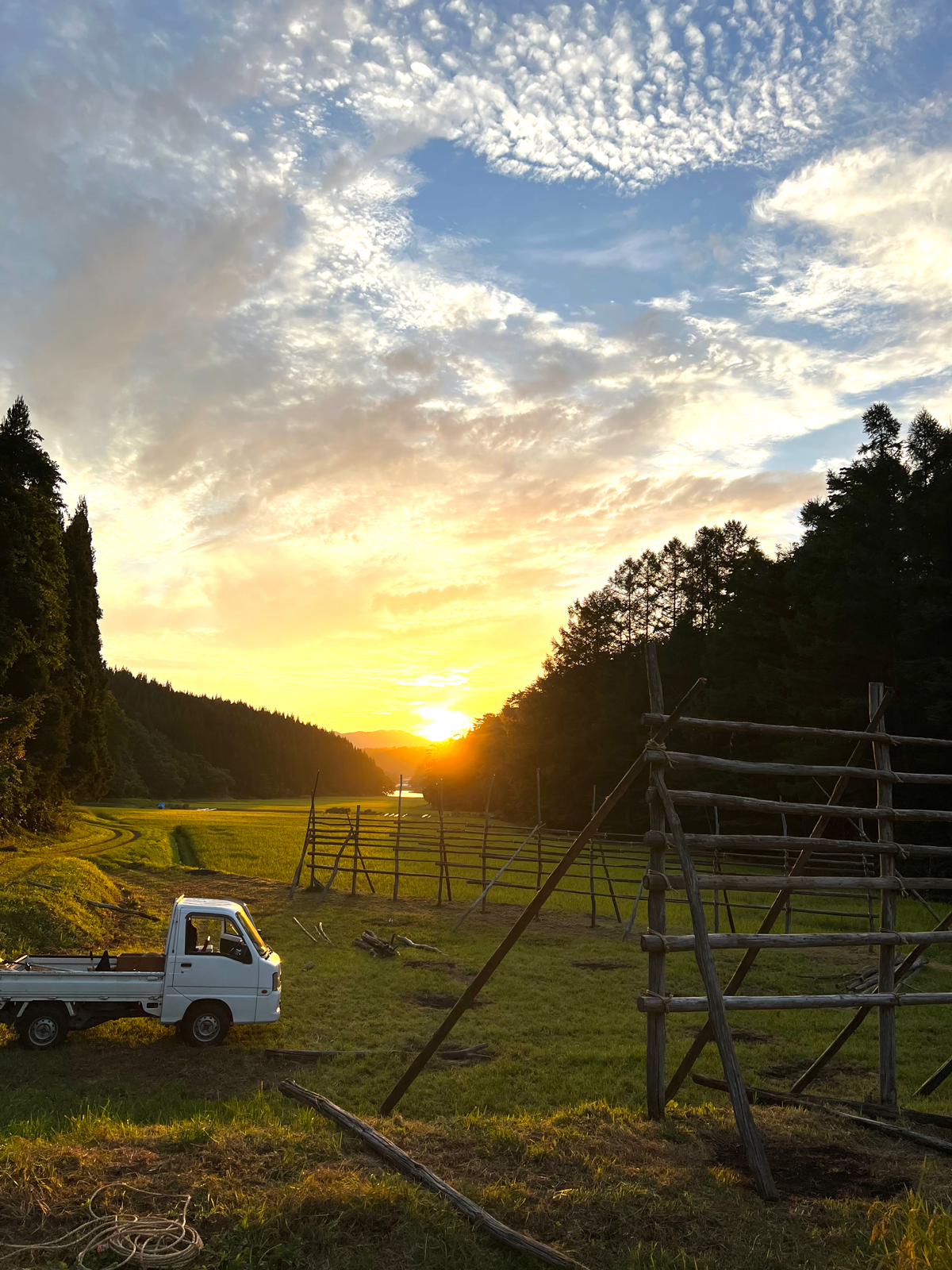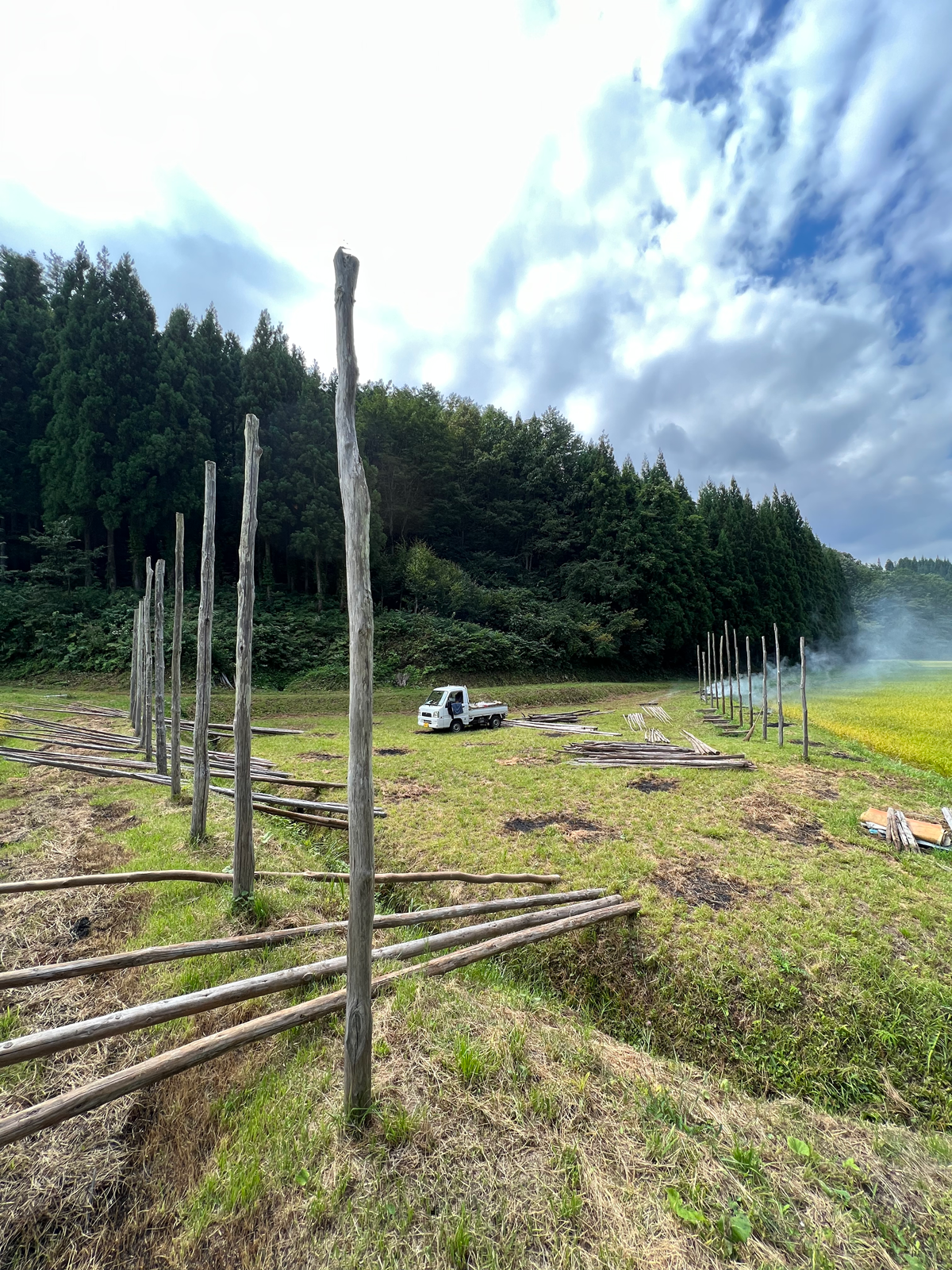 天日干し終了後に脱穀されて残った稲ワラは牛の餌となり、その牛の排泄物は牛糞堆肥となって春に田んぼに撒かれます。つまり「はさがけ」は循環農業の象徴でした。田代地区では今でも小規模畜産と稲作の兼業農家が残っており、秋には貴重なはさがけの風景が楽しめます。